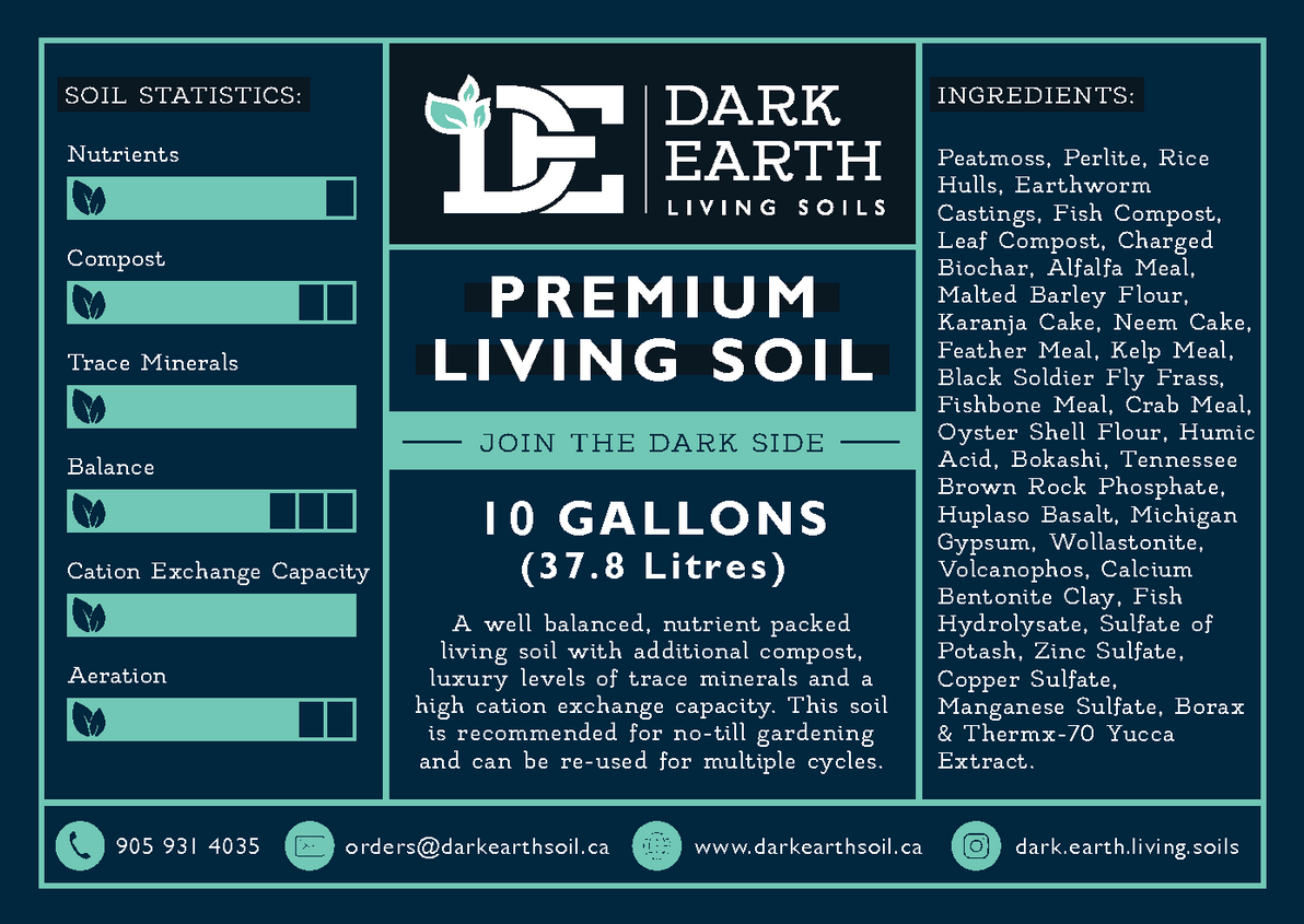A well balanced, nutrient packed and biologically active living soil containing the following ingredients which are all approved for organic use: Peatmoss, Perlite, Earthworm Castings, Fish Compost, Leaf Compost, Biochar (charged with fish hydrolysate, bacillus subtilis and trichoderma), Alfalfa Meal, Malted Barley Seed, Karanja Cake, Neem Cake, Feather Meal, Kelp Meal, Insect Frass, Fishbone Meal, Crustacean Meal, Oyster Shell Flour, Humic Acid, Tennessee Brown Rock Phosphate, Huplosa Basalt, Gypsum, Wollastonite, Volcanophos, Bentonite Clay, Yucca, Zinc Sulfate, Copper Sulfate, Manganese Sulfate & Borax.